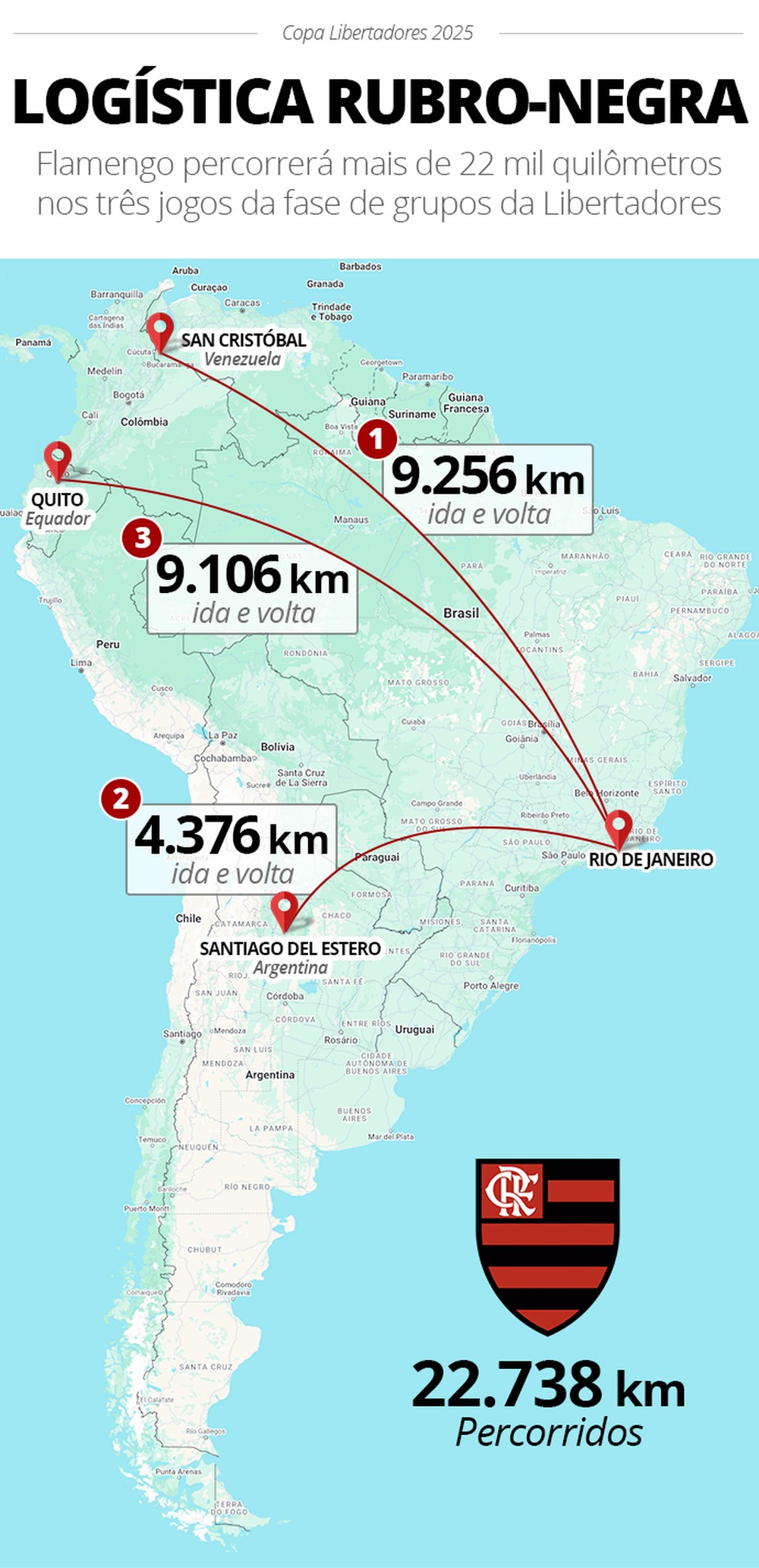 Flamengo zdaje sobie sprawę, że pierwsza część drogi, którą będzie musiało pokonać w poszukiwaniu czwartego tytułu Copa Libertadores, będzie długa. W fazie grupowej Rubro-Negro przemierzą ponad 22 tysiące kilometrów, odwiedzając trzy kraje: Wenezuelę, Argentynę i Ekwador. Podróże będą wymagające, a oprócz lotów czeka ich także przejazd autobusem.